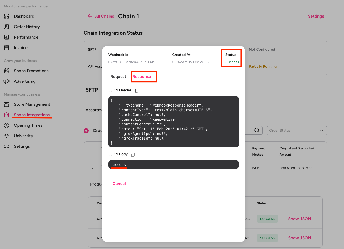 Order should now appear on your webhook. You can review in API >order API > orders section in Partner Portal